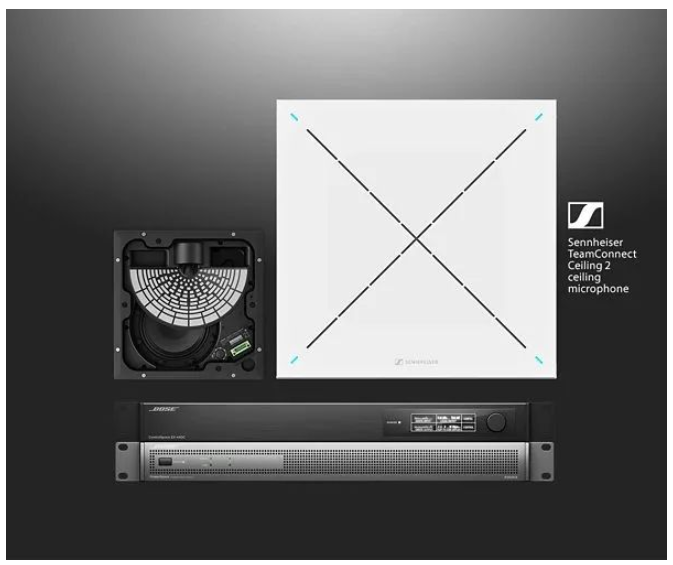 而针对全面集成的会议室,Bose ES1吸顶音频解决方案则能够提供完整的远程会议音频系统,结合Bose EdgeMax吸顶扬声器和合作伙伴Sennheiser的TeamConnect Ceiling 2天花式吊顶阵列麦克风(TCC2)、Bose功放和DSP的卓越性能,打造无缝的会议体验。同时ControlSpace EX远程会议音频处理器提供可扩展的平台,使得会议系统更加稳定可靠。