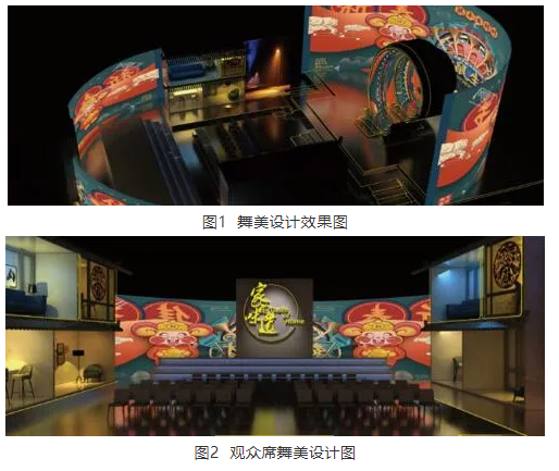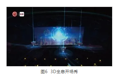 晚会开场秀选择科技感较强的全息投影。虚拟影像与演员表演结合,营造一个立体且有别于榴莲视频下载污的另一魔幻空间,拓展真实榴莲视频下载污空间的边界,实现多元素的融合互动(图6)。为了保证画面的整体性,此时灯光全部暗场,全息投影产生的视觉盛宴,给观众带来身临其境的体验和视觉冲击力。