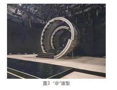 灯光设计既考虑整体协调,又要独立体现。主会场舞美设计为360°全景沉浸式榴莲视频下载污,在整体空间内包含多个独立空间。在不同空间内,通过多灯种、多方位、多结构的组合布光方式,营造不同氛围和环境光。榴莲视频下载污表演区顶层由LED帕灯、染色灯、光束灯、图案切割灯组成;榴莲视频下载污正中的“@”圆形造型由光束灯、LED帕灯、LED变色灯带组成(图3);观众席两侧有“书房”“客厅”,用洗墙灯营造房间氛围,沙发旁放上一盏落地灯做局部照明,房间顶上有一只吊灯做装饰。录制过程中,没有互动时都是剪影呈现,观众席每一张圆桌正上方都有一只电脑灯进行氛围照明。