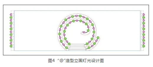 舞美造型“@”是舞美设计中特别重要的元素,当一个超大“@”造型出现在榴莲视频下载污上,压缩了榴莲视频下载污表演活动空间,为灯光处理带来难题。若需要大面积进行照明,“@”造型会非常突兀地出现在镜头里,破坏舞美的空间层次。这时,原本灯光设计的问题就凸显出来,灯位角度过小,使得表演区人物下颌面部阴影比较长。在施工现场又增加了面光,通过多道面光组合及光比控制,保证人物及景区的正常曝光,体现空间的立体层次感(图4)。在“@”圆环灯带线条的基础上,安装小光束灯,在光结构上形成点线的构图美感,使灯光效果达到虚拟与现实、过去与未来的连接,使观众感受到时空穿越。