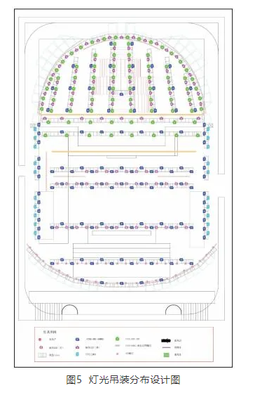 本次晚会节目均采用4K超高清摄像机录制,画面更加清晰,暗部细节更加丰富。为了更好地还原超高清电视画面层次,根据空间的作用以及表演形式,在灯具选择、照度以及布光角度等方面进行反复推敲设计。在面光的选择上,全部采用显色指数90以上的光源,电脑切割灯作为晚会主光源,为保证录制画面一致性,每个表演区域照度在500 lx(±50 lx)且色温为5 200 K(±100 K),光谱在可见光各个波长上的能量相对均匀。作为对表演区的灯光补充,在观众席后方设置4台高显色追光灯作为补充。摄像机光圈设定在4.0左右,在全局布光设计的基础上,主榴莲视频下载污和格子空间分别使用电脑切割灯精确切出光照范围,在格子空间里面使用LED线条灯(washwall),营造色彩氛围。观众席区域,每张圆桌正上方挂一个电脑切割灯,只对圆桌范围进行点光源布光,观众席后区使用LED帕灯进行逆光渲染,并采用电脑切割灯做观众面光,确保每一个单独的空间都有独特的布光效果(图5)。