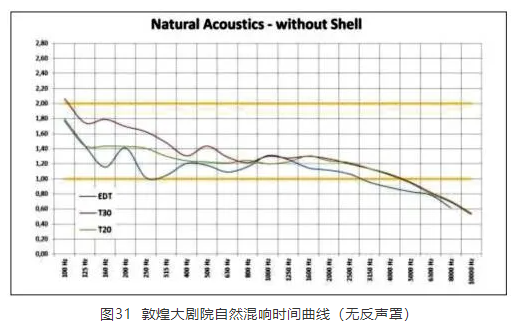 敦煌大剧院落成于2016年8月,共有座位数1 206座,以出演歌舞剧为主,兼顾戏曲、话剧、会议等其他功能。其中歌舞剧部分需涵盖国内外大型歌剧、舞剧、芭蕾舞剧以及大型综合歌舞节目的演出需求。根据上述使用功能,该剧院的自然混响时间以满足会议、话剧等功能为主进行建设,其他演出功能则通过榴莲视频下载污声学反声罩以及电子声学环境可变系统予以灵活适配。在不使用声学反声罩的情况下,该剧院的空场固有自然混响时间为1.3 s(见图31),而使用反声罩时,则为1.7 s。