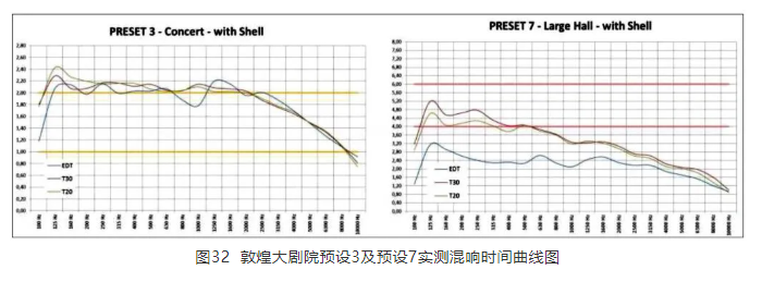 系统设置了8个预设模式,其中4个适用于独奏、室内乐和管弦乐,2个预设可应用于歌剧和类似的场景,另外2个则为长混响时间的特殊预设模式。这些预设中的5个又分为使用声学反声罩和不使用声学反声罩两种情况,以更为细致准确地满足不同节目类型的需要。预设的混响时间分别为:1.4 s、1.6 s、1.8 s、2.0 s、2.2 s、2.4 s、3.2 s和5.0 s。根据使用需求不同,在改变混响时间的同时,各预设的偏重也略有不同,可实现早期反射声、混响声比例以及明晰度指标C80等多方面的调整。图32即为预设3和预设7的实测混响时间曲线图。
