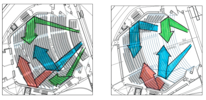 为了减小回声、提高语言清晰度,同时加强混响,提升音乐丰满性,剧院歌剧厅内饰面、座位等的材料选择与外形设计十分重要。一般情况下声音最佳反射时间为1-1.3秒。