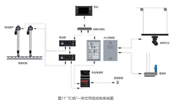 汇焰开发的一体式机械智能吊挂控制系统(见图11),实现了传统PLC控制吊杆和数控葫芦系统的统一控制。系统通过数控葫芦吊挂桁架作为固定吊杆的补充,原有吊杆与桁架可通过该系统实现一体式控制。系统根据需要组合扩展或临时变更,通过对数控葫芦编程控制,可实现桁架各种高度和角度的升降、偏转。该系统也具有实时监测承重载荷、榴莲视频下载污机械位置和运动状态、远程控制时间码同步、可视化对话界面等功能。