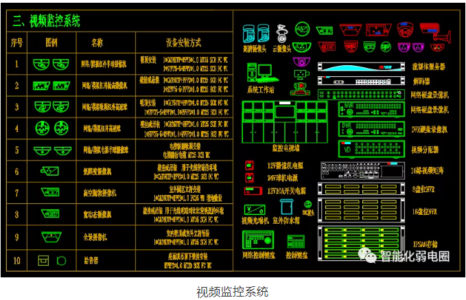 视频监控系统是智能化l弱电系统最常用的系统之一,整套系统包括前端摄像头,线缆,交换机,存储,解码,大屏等设备组成,视频监控系统涉及到的弱电设计图标主要有半球摄像机,球机,枪机,全景摄像头,高考抛物摄头,NVR,IPSAN,矩阵,流媒体服务器,解码器,电脑终端,开关电源等等。