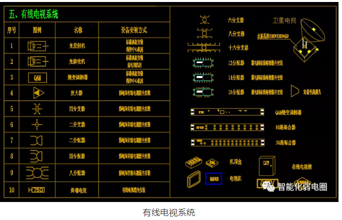 有线电视系统弱电设计图标主要有光发射机,光接收机,放大器,分支器,分配器等组成。