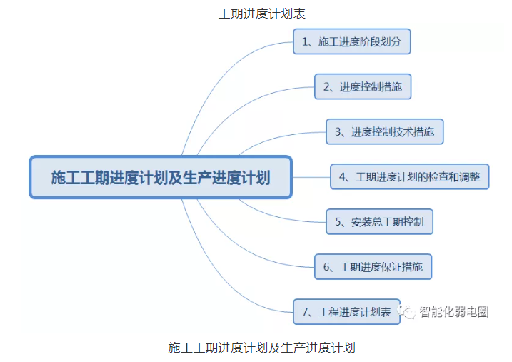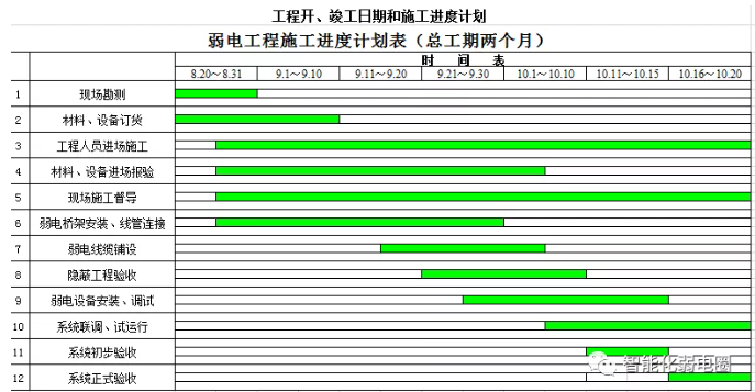 工程进度计划表:制定工期进度计划表,分为项目准备、施工深化设计、设备线材采购、管线施工、设备安装、系统调试、系统培训、资料整理等阶段,做好工期进度安排。