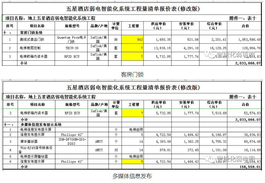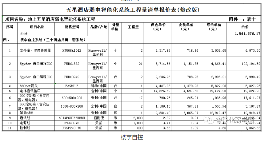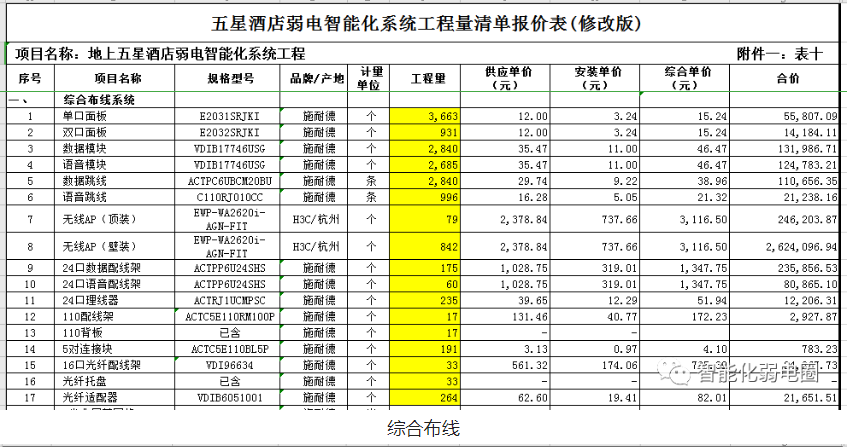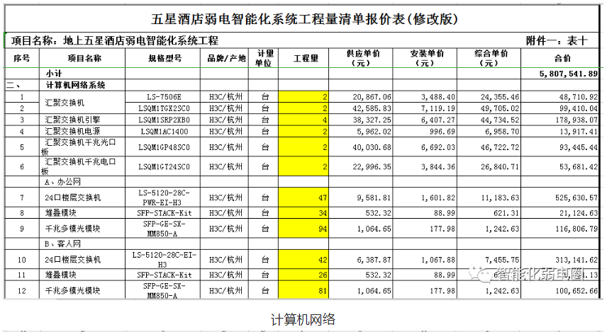之前一直有筹备建设酒店的朋友说,不知道酒店智能化弱电建设,现在以酒店为例,更新一套智能化弱电报价清单。酒店弱电系统非常齐全,有综合布线、计算机网络、视频监控、楼宇自控、入侵报警、电子巡更、门禁一卡通、背景音乐及消防广播、无线对讲、客房门锁、多媒体信息发布等10几个子系统,总造价达千万级。