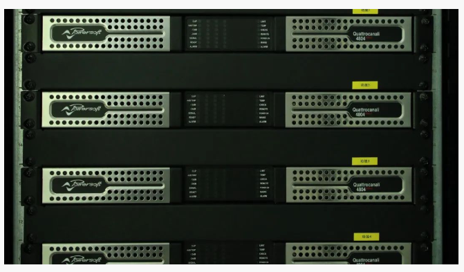 功率放大器全部采用Powersoft Quattrocanali 4804 DSP+DANTE数字功率放大器。扩声控制室与功放机房之间采用光纤网络音频的方式进行远距离传输,缩减模拟线路传输距离,降低线路损耗,有效提升系统内音频信号的传输质量。
