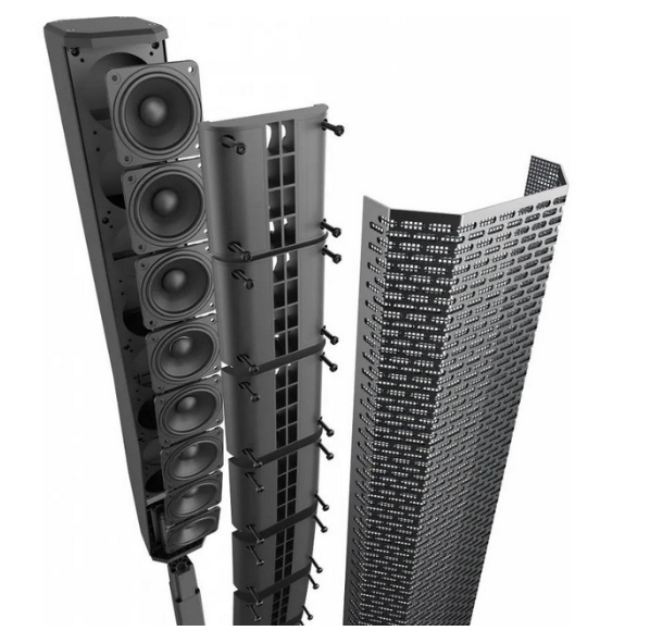 阵列的外箱由耐用的复合材料制成,并配有符合人体工程学的铝制把手。超低音采用15mm木制外箱,里面含有一个12寸低音单元,采用高效的层流通风口设计。阵列和超低通过对称的铝杆与内部布线和磁吸闩锁连接。扬声器装有一个黑色粉末喷涂的18 gauge标号钢制网罩作保护用途,还包含一个阵列/拉杆运输箱。先进的D类放大器可提供高达1,000W的功率。
